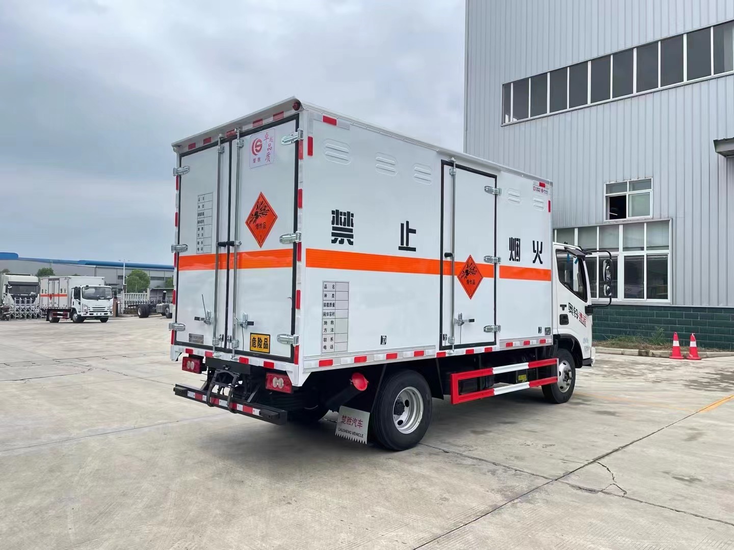 嚴(yán)格按照公告尺寸制作。外板采用優(yōu)質(zhì)冷軋鋼板帶百葉窗,內(nèi)飾為導(dǎo)電性能良好的鋁平板有透氣孔,矩形骨架結(jié)構(gòu)內(nèi)部填充防潮阻燃擠朔板,復(fù)合加鉚合工藝。廂體四周鋁合金包邊及包角,車廂底板鋪設(shè)防靜電膠皮,廂體前臉50公分高鋪設(shè)防靜電膠皮。后部設(shè)置對開門,廂體內(nèi)部兩側(cè)安裝捆綁貨物的臥環(huán)。廂體內(nèi)部安裝煙霧報(bào)**器及防盜報(bào)**感應(yīng)器。車廂一周粘貼橙色放光帶,箱體粘貼 菱形告示牌,安全告示牌,危險(xiǎn)品牌,箱體安裝示廓燈(前白后紅),拖地靜電帶,等電位連接。(可根據(jù)需求選擇單開門雙開門等多樣化右部側(cè)門)
