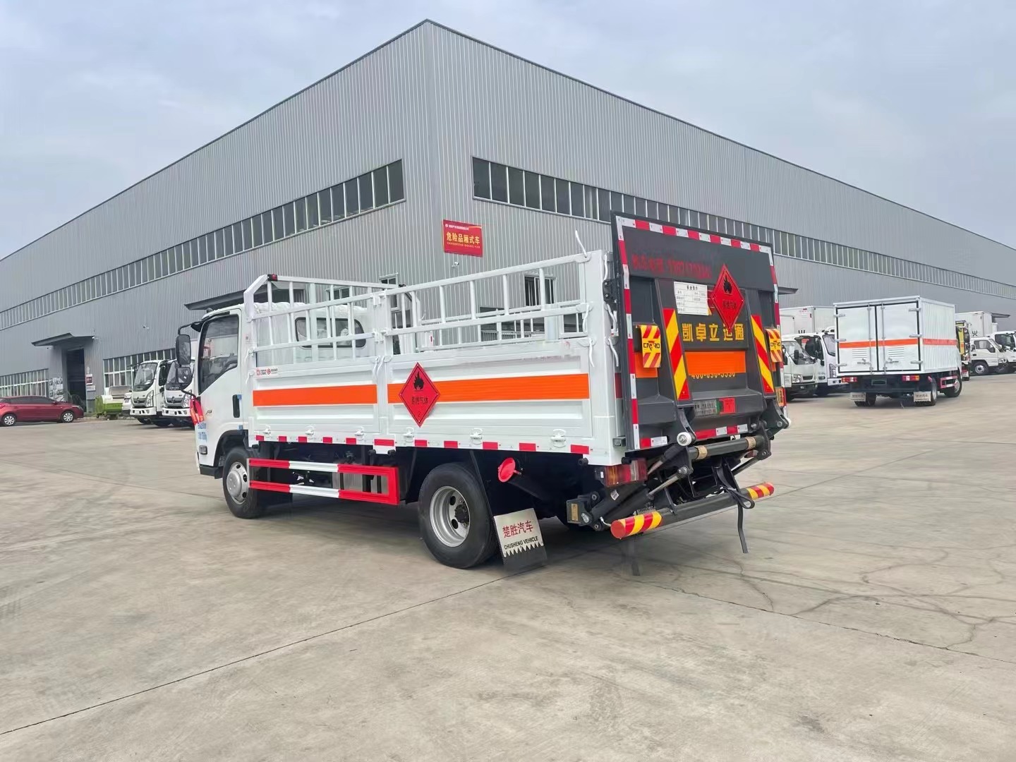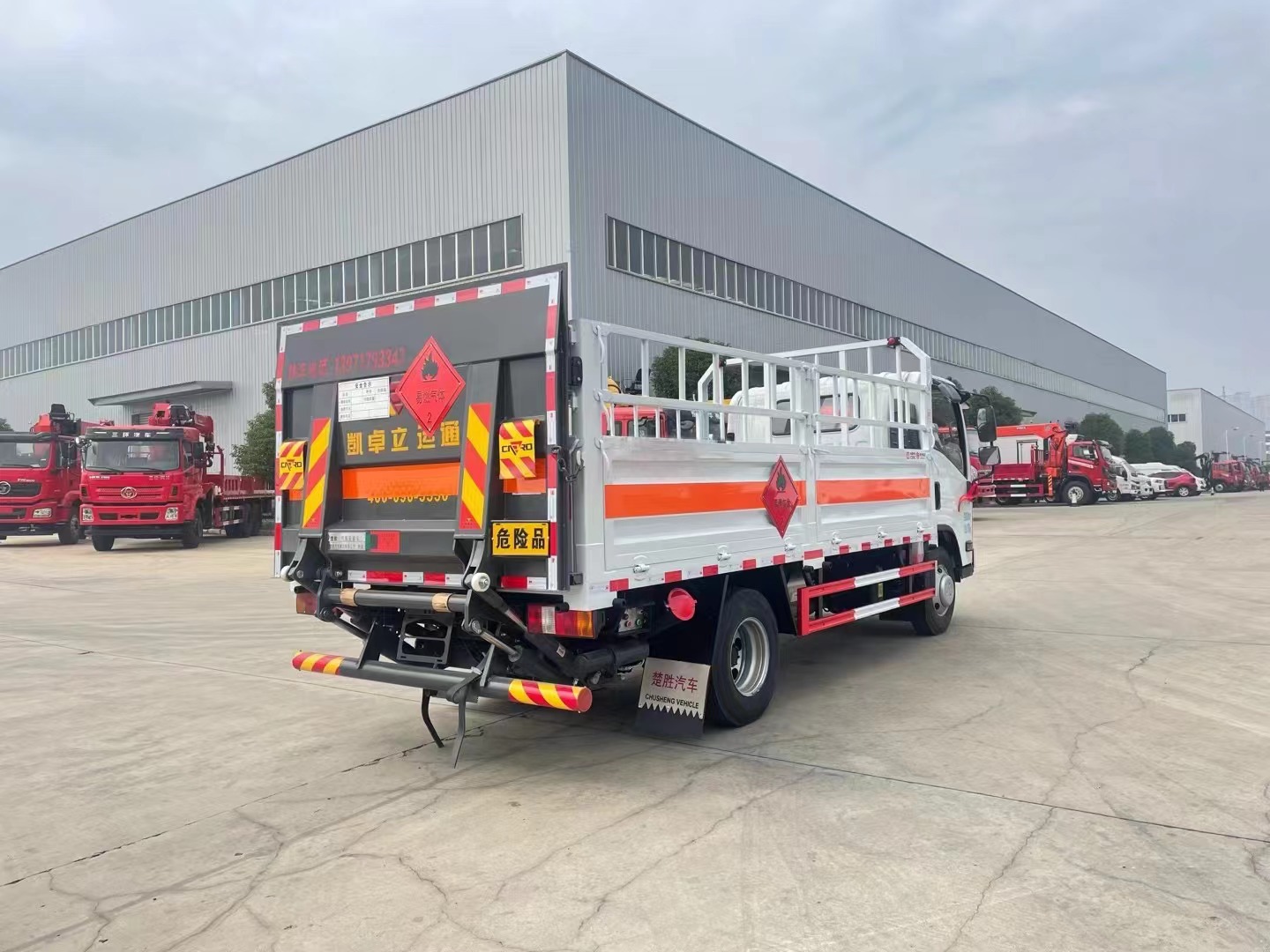 廂體邊板采用1.2mm冷板,底板花紋鋼板,花欄及花欄立柱可拆卸,底部立柱固定,底板上方鋪靜電膠皮,底板均做防銹處理,車廂一周粘貼橙色反光帶,箱體粘貼菱形標(biāo)志牌,安全告示牌,危險(xiǎn)品牌,拖地靜電帶。