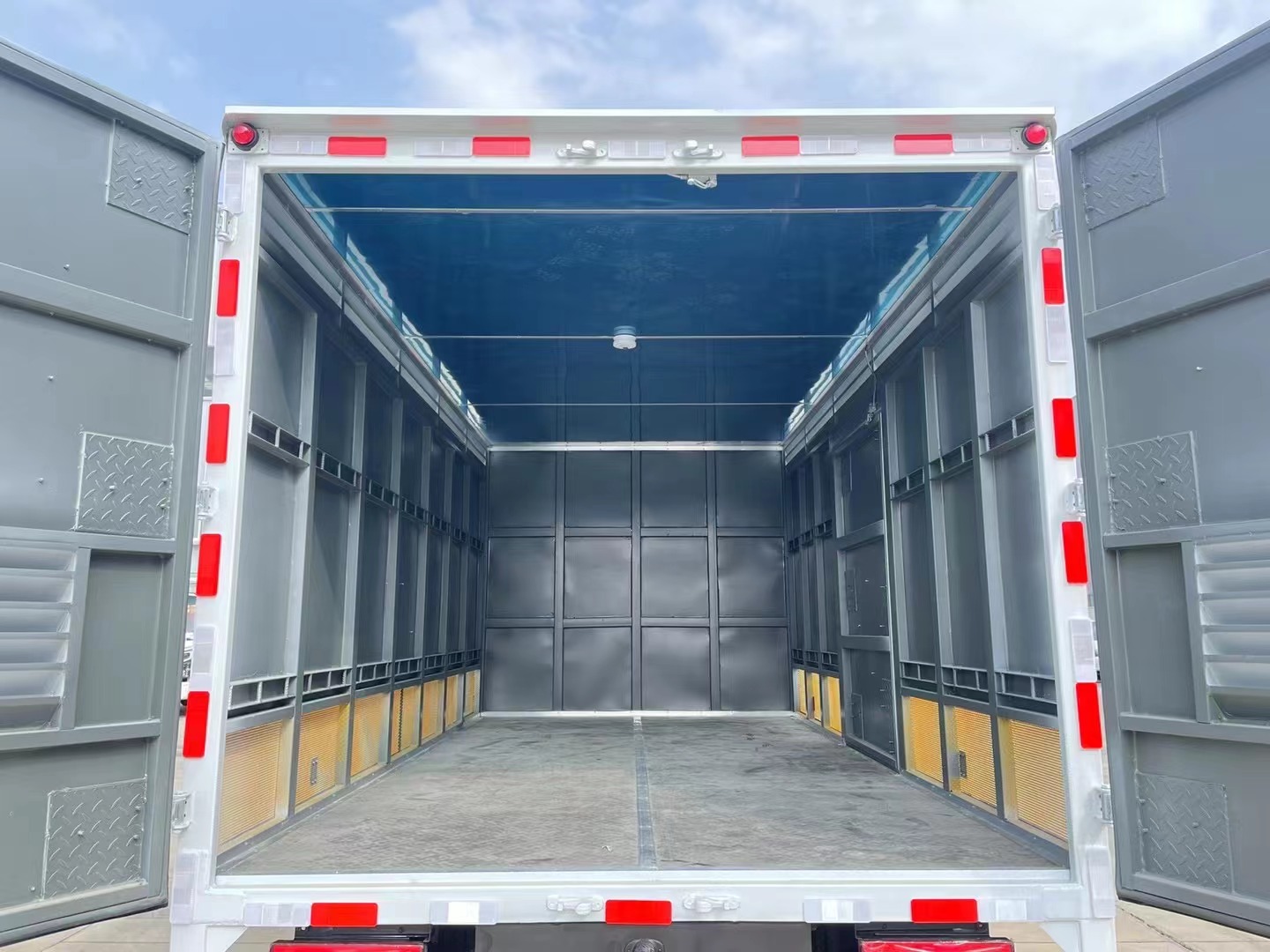 1,復(fù)合板工藝:嚴(yán)格按照公告尺寸制作。外板采用優(yōu)質(zhì)烤漆板(顏色可選:白,灰,檸檬黃)帶百葉窗,內(nèi)飾為導(dǎo)電性能良好的鋁平板有透氣孔,矩形骨架結(jié)構(gòu)內(nèi)部填充防火阻燃材料,復(fù)合加鉚合工藝。廂體四周鋁合金包邊及包角,車廂底板鋪設(shè)防靜電膠皮,廂體前臉50公分高鋪設(shè)防靜電膠皮。后部設(shè)置對開門,右側(cè)單開門,廂體內(nèi)部兩側(cè)安裝捆綁貨物的臥環(huán)。廂體內(nèi)部安裝煙霧報(bào)**器,門上安裝防盜報(bào)**器。車廂一周粘貼橙色反光帶,箱體粘貼菱形標(biāo)志牌,安全告示牌,危險(xiǎn)品牌,箱體安裝示廓燈(前白后紅),拖地靜電帶。
