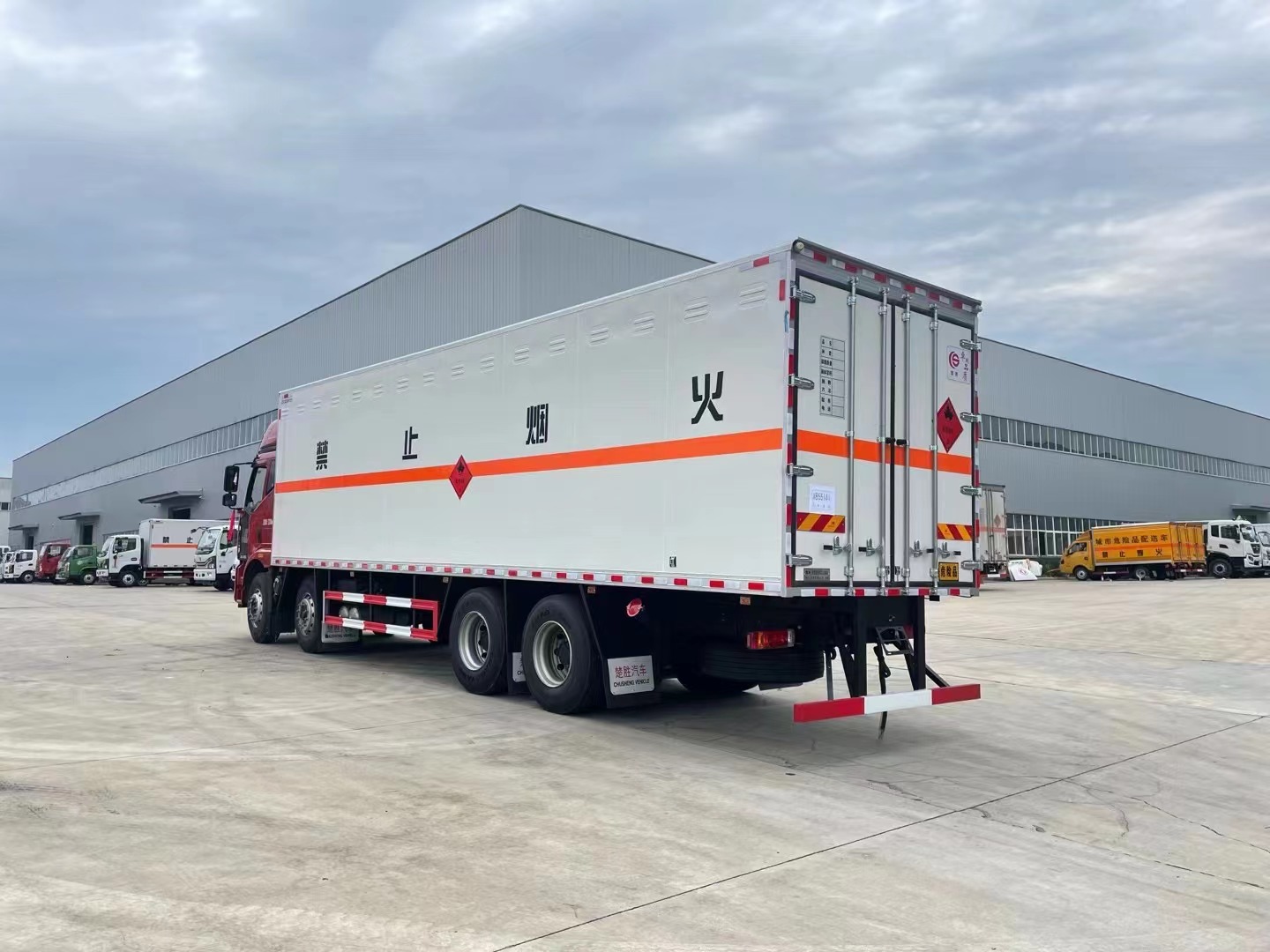 嚴(yán)格按照公告尺寸制作。外板采用烤漆板帶百葉窗,內(nèi)飾為導(dǎo)電性能良好的鋁平板有透氣孔,矩形骨架結(jié)構(gòu)內(nèi)部填充防火阻燃材料,復(fù)合加鉚合工藝。廂體四周鋁合金包邊及包角,車廂底板4mm鋪設(shè)防靜電膠皮,廂體前臉50公分高鋪設(shè)防靜電膠皮。后部設(shè)置對(duì)開(kāi)門,右側(cè)一組雙開(kāi)門,廂體內(nèi)部?jī)蓚?cè)安裝捆綁貨物的臥環(huán)。廂體內(nèi)部安裝煙霧報(bào)**器及防盜報(bào)**感應(yīng)器。車廂一周粘貼橙色反光帶,箱體粘貼 菱形標(biāo)志牌,安全告示牌,危險(xiǎn)品牌,箱體安裝示廓燈(前白后紅),拖地靜電帶。