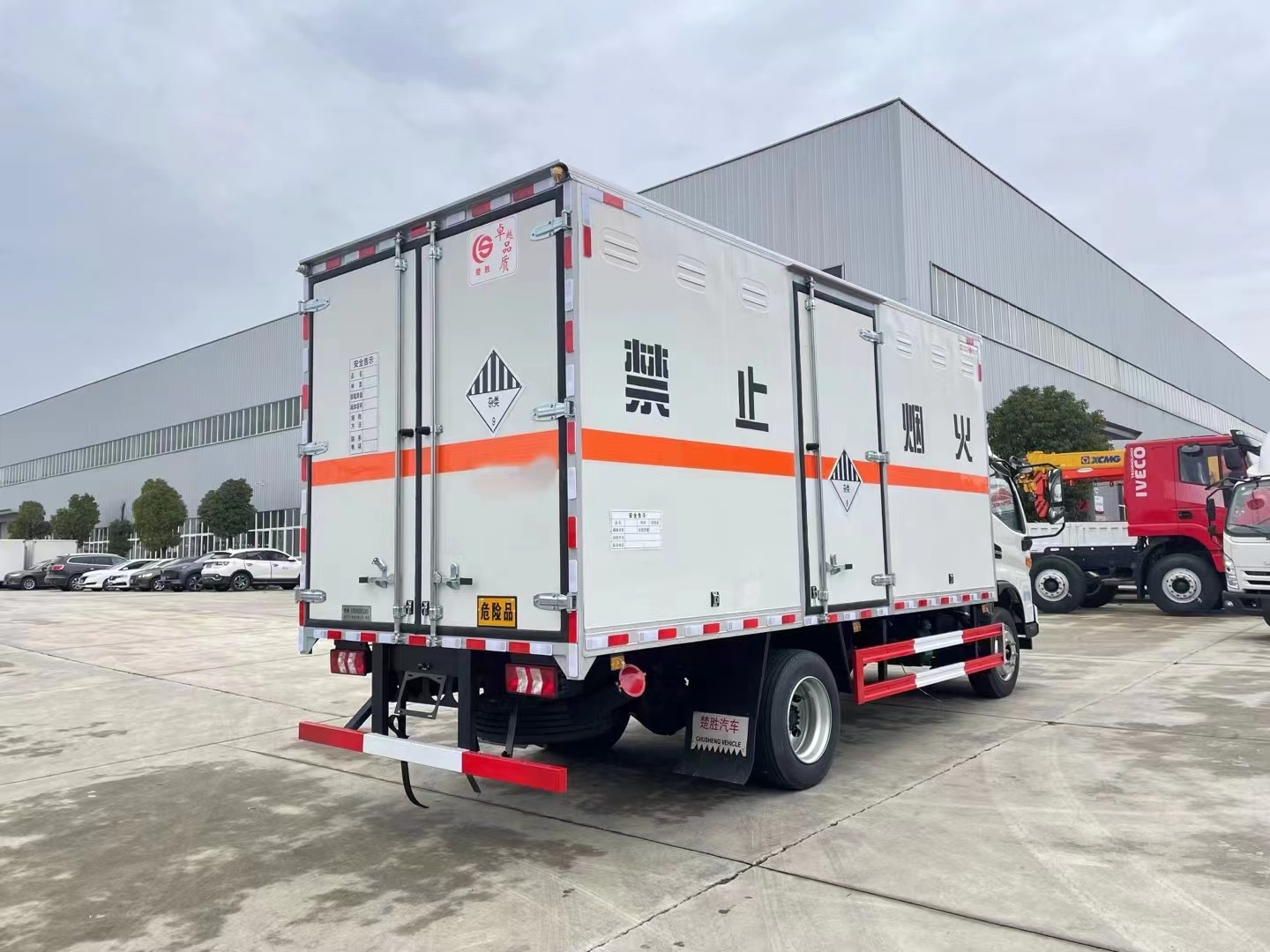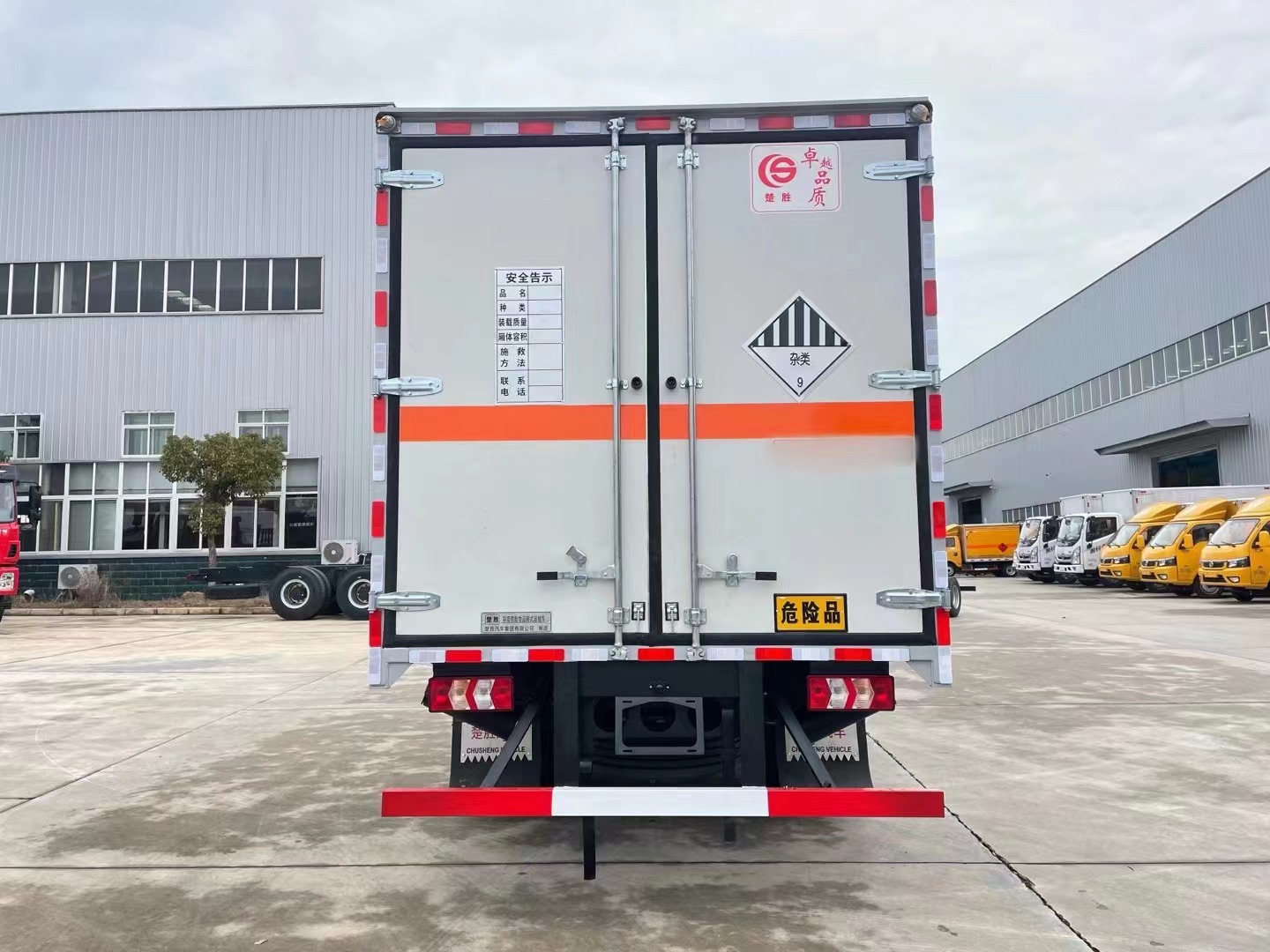嚴(yán)格按照公告尺寸制作。外板采用烤漆板帶百葉窗,內(nèi)飾為導(dǎo)電性能良好的鋁平板有透氣孔,矩形骨架結(jié)構(gòu)內(nèi)部填充防火阻燃材料,復(fù)合加鉚合工藝。廂體四周鋁合金包邊及包角,車廂底板3mm鋪設(shè)防靜電膠皮,廂體前臉50公分高鋪設(shè)防靜電膠皮。后部設(shè)置對開門,右側(cè)單開門,廂體內(nèi)部兩側(cè)安裝捆綁貨物的臥環(huán)。廂體內(nèi)部安裝煙霧報(bào)**器及防盜報(bào)**感應(yīng)器。車廂一周粘貼橙色反光帶,箱體粘貼 菱形標(biāo)志牌,安全告示牌,危險(xiǎn)品牌,箱體安裝示廓燈(前白后紅),拖地靜電帶。